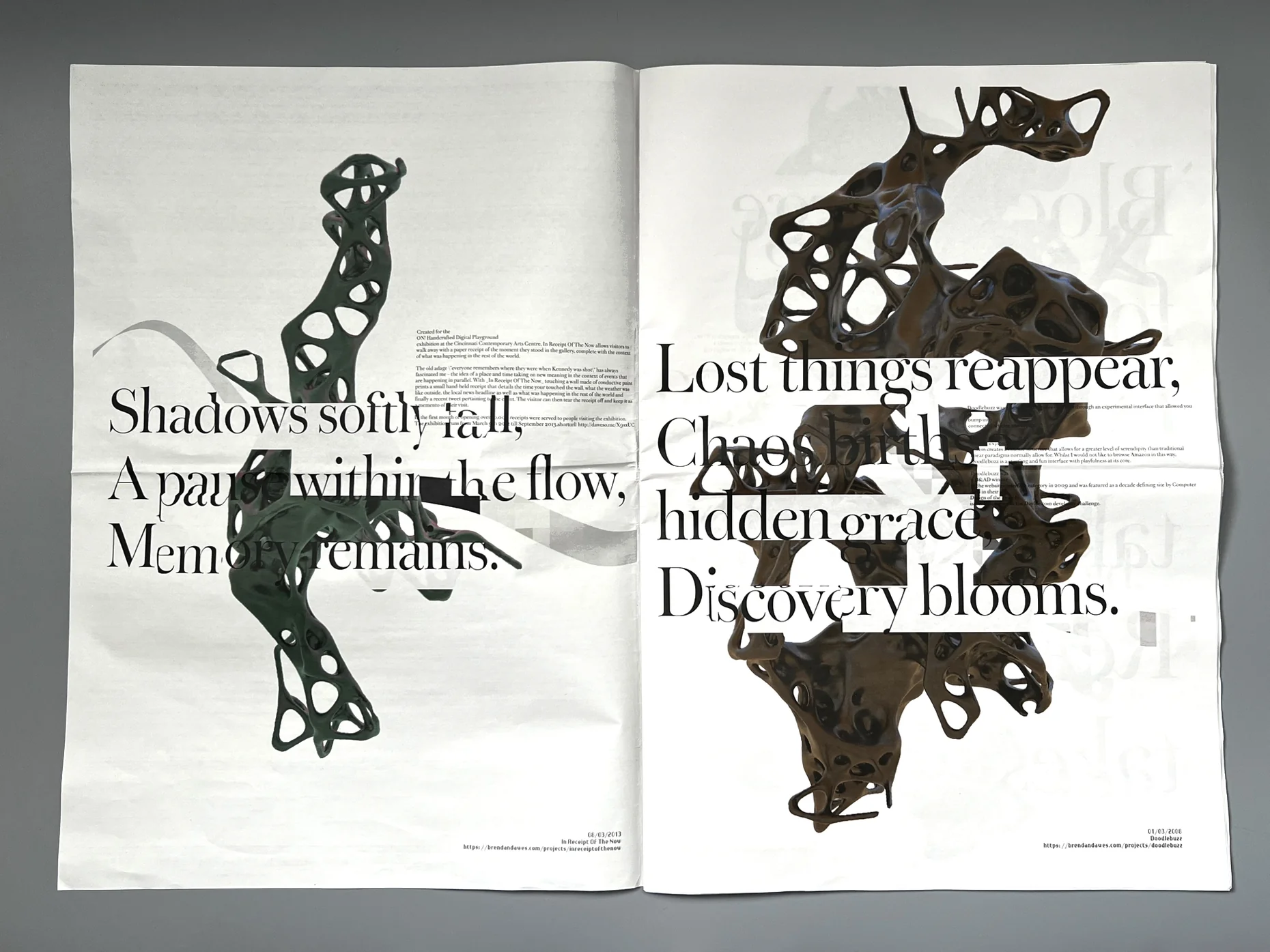 Text is generated through a similarly experimental process. Using a locally run language model, Dawes fed in original project texts and asked the system to produce a haiku for each — machine-written poetry that sits alongside the sculptural imagery and archival material. These elements are then combined via a custom compositing system, built using an API drawn directly from his website. Each run produces a new layout, meaning the publication itself is the result of generative variability rather than fixed design.
