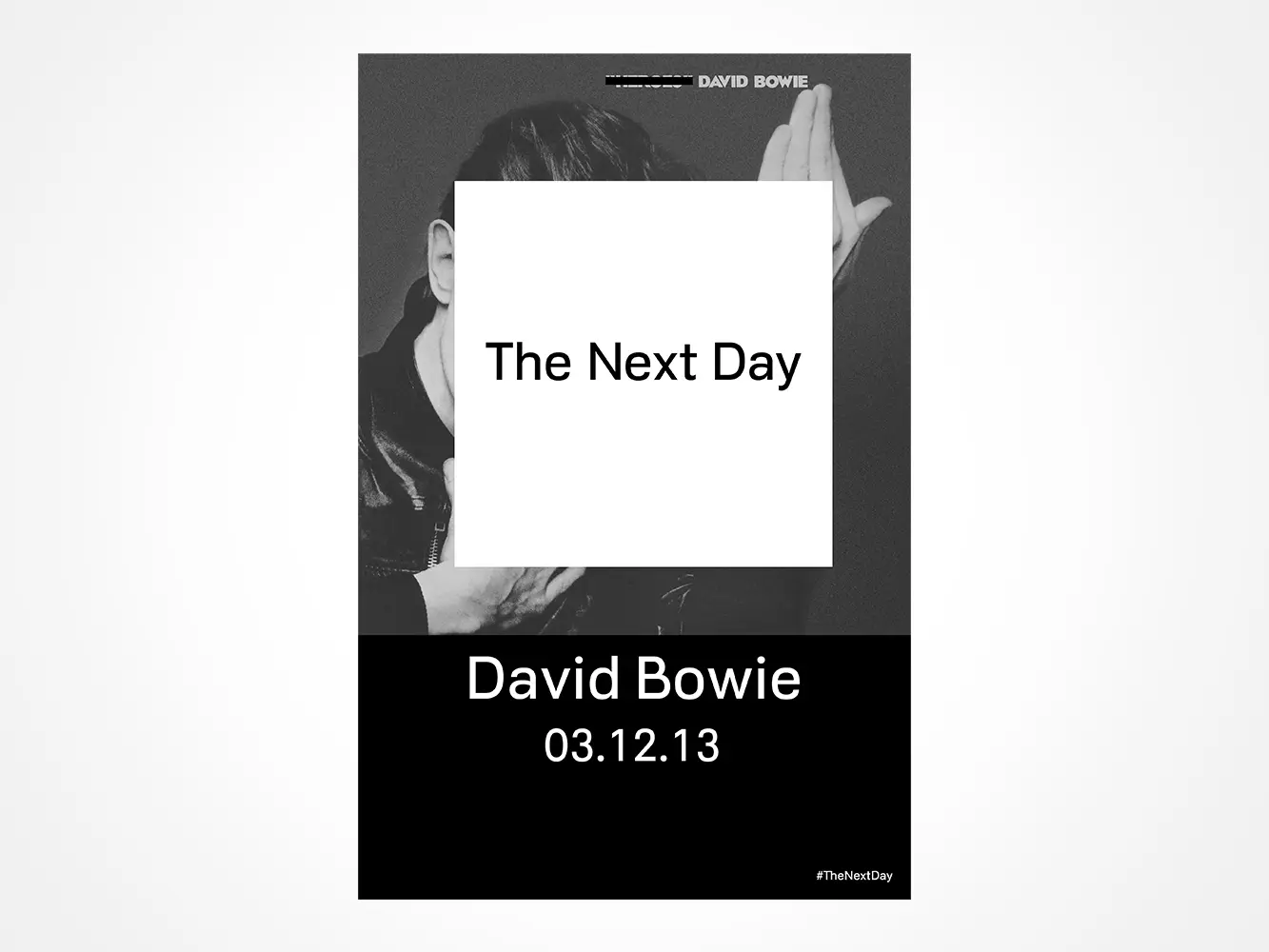 An extremely rare original flyposter produced in New York for the 2013 launch of David Bowie’s “The Next Day,” featuring Jonathan Barnbrook’s now-iconic white square intervention over Bowie’s original “Heroes” cover.